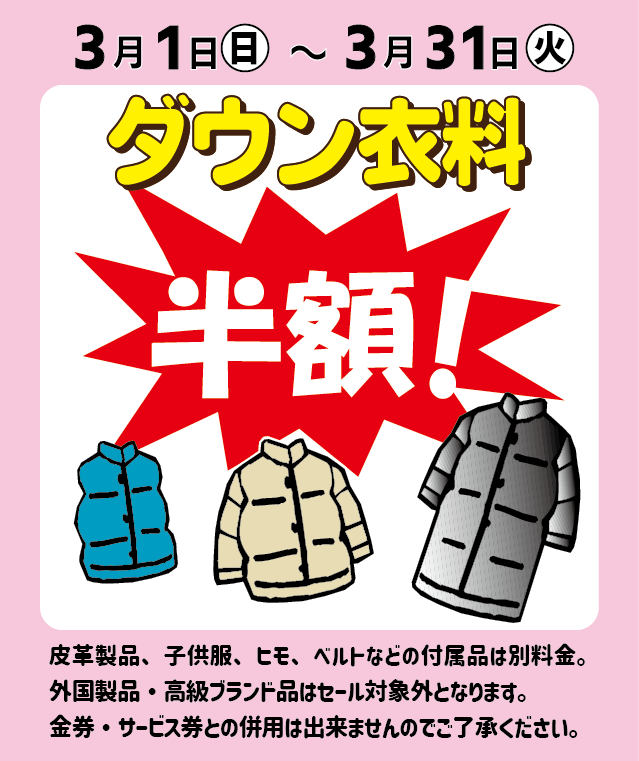 【3月】店頭セール!!『ダウン衣料』半額セール!